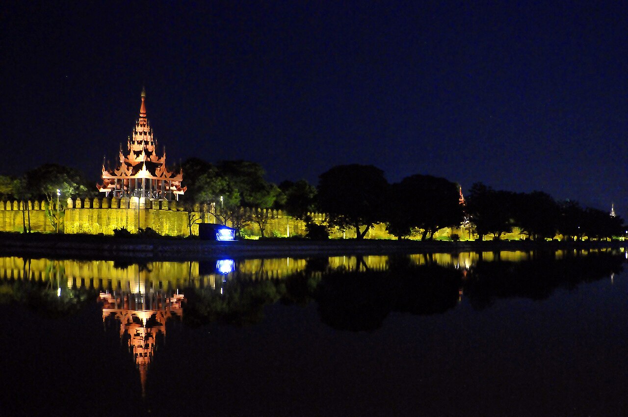 - Mandalay Palace: The whole palace complex was destroyed by a fire during World War II. The palace walls, the city gates with their crowning wooden pavilions and the surrounding moat, “Mya-nan-san-kyaw Shwenandaw”, were rebuilt using forced labor. A model of the Mandalay Palace, Nanmyint-saung and Mandalay Cultural Museum are located inside the palace grounds.